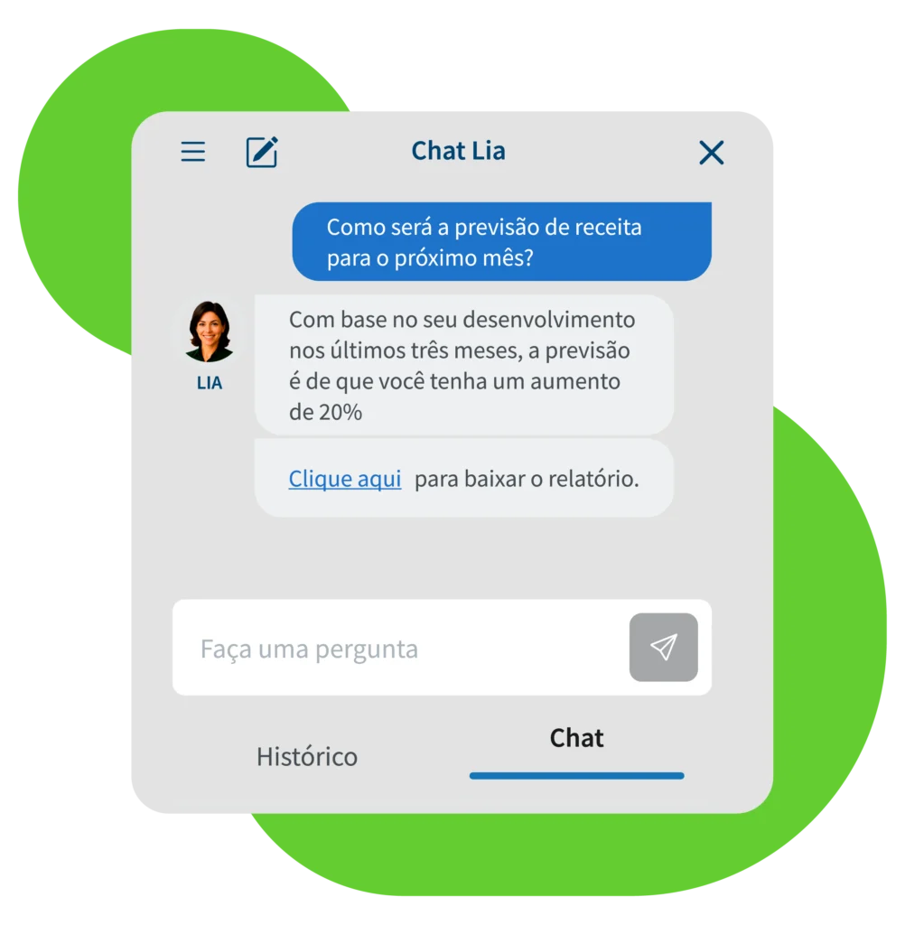 Com a LIA, você tem uma consultora inteligente que conhece sua realidade — e te entrega previsão de inadimplência, projeção de receita e alertas úteis para a gestão do dia a dia.